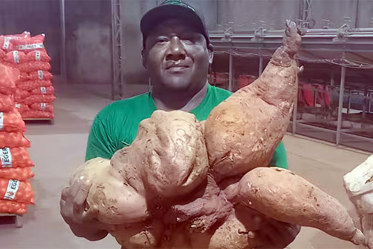 De início, o agricultor José Augusto Alves pensou que fosse uma pedra, depois, logo após cutucar a tal coisa com um pedaço de pau, ele cogitou que fosse uma cobra, mas não, o barulho era de uma batata-doce de 35,4 kg. A descoberta diferente ocorreu em Santa Juliana, no Alto Paranaíba, em 11 de agosto.