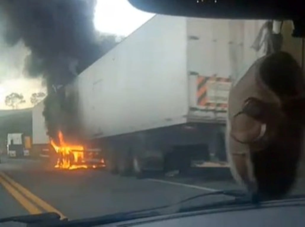 Na manhã desta sexta-feira (5) uma carreta-baú pegou fogo quando trafegava na Rodovia Santos Dumont, BR-116.