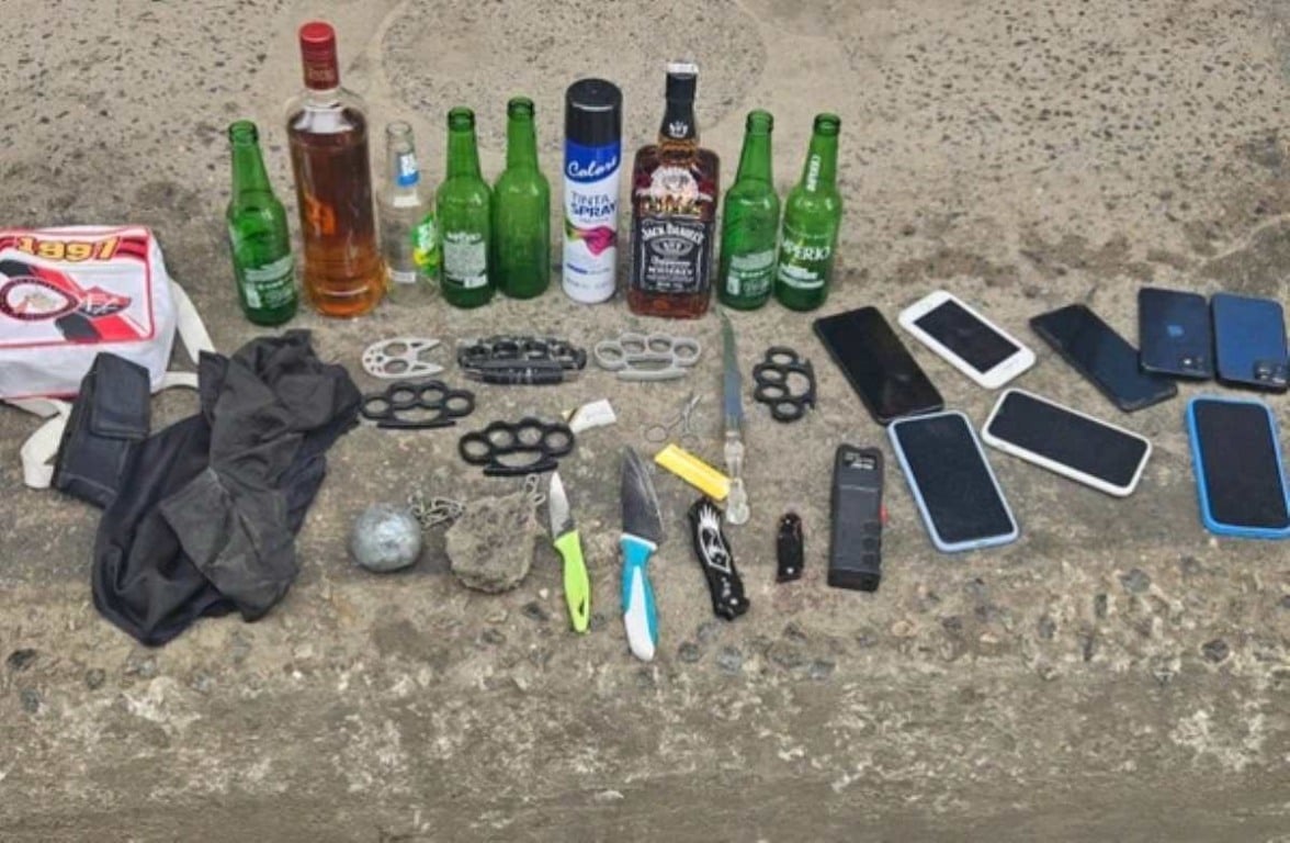 Segundo a Polícia Militar (PM), o grupo foi localizado dentro de um transporte coletivo após denúncias. Durante a abordagem, foram apreendidos uma arma de choque, oito garrafas de vidro, um artefato explosivo artesanal, cinco facas, seis soqueiras, celulares, uma tesoura, uma caixa de lâminas de inox, quatro balaclavas, tinta spray, um pacote de seda e munição calibre .45.