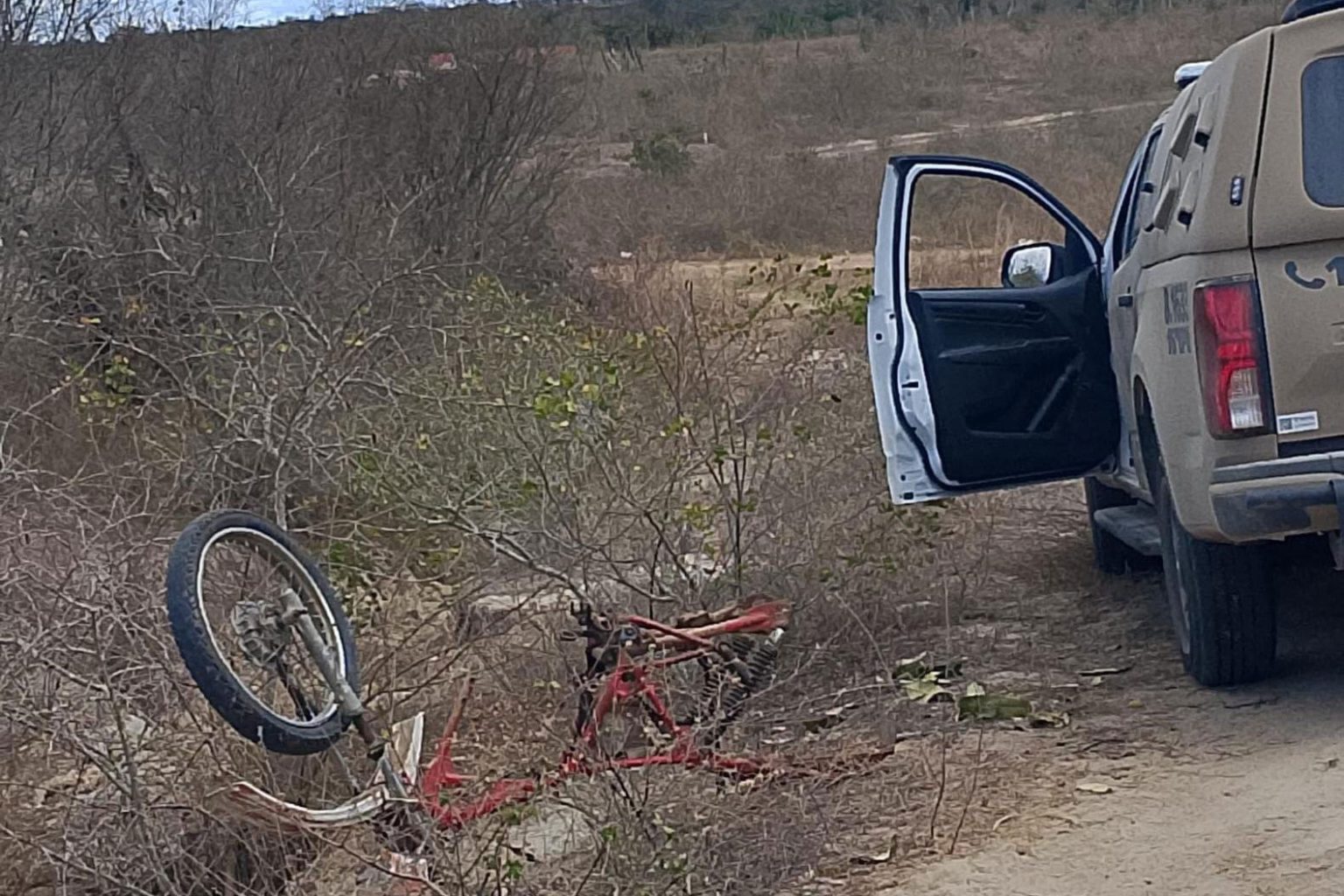 A moto, que aparenta ser uma Honda XL 125 vermelha, estava com peças espalhadas, como painel, pneu dianteiro, farol e manetes. O chassi estava inelegível, o que dificultou a identificação imediata. A placa, feita à mão, indicava que o veículo seria da cidade de Conceição do Coité, que fica na mesma região.