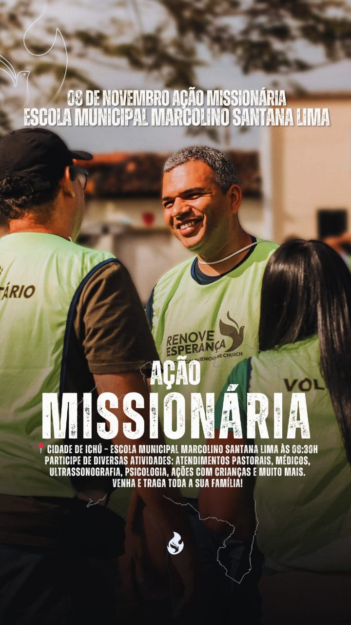 A Igreja Assembleia de Deus em parceria com o Projeto Renova-me realizará sábado, 08 de novembro, uma importante Ação Missionária na Escola Municipal Marcolino, começando às 08:30 da manhã.