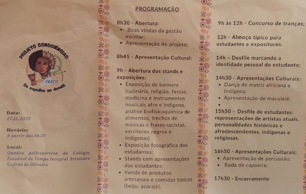 O Colégio Estadual de Tempo Integral Aristides Cedraz de Oliveira (CEACO), em Ichu, realizará no dia 27 de novembro, das 8h30 às 17h30, a Mostra Cultural e Científica do Projeto Consciências: Do espelho ao dendê.