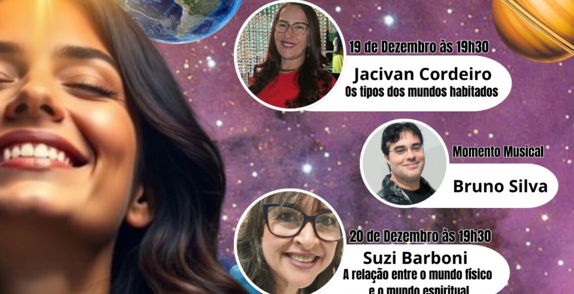 No dia 20 de dezembro, também às 19h30, a palestrante Suzi Barboni apresentará a conferência “A relação entre o mundo físico e o mundo espiritual”. A programação contará ainda com o momento musical conduzido por Elmo Carneiro.