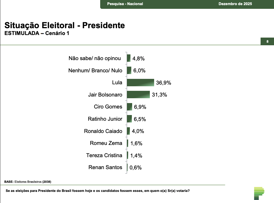 Um dos cenários estimulados apresentados pela pesquisa considera o ex-presidente Jari Bolsonaro como possível candidato. Atualmente inelegível e cumprindo pena de mais de 27 anos por tentativa de golpe de estado, ele soma 31,3% frente a 36,9% de Lula.