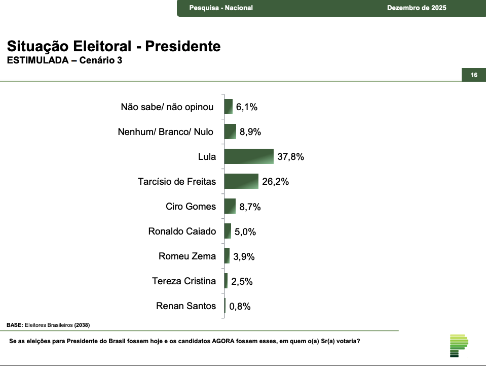 Até então nome mais forte para disputar o pleito como candidato da direita, Tarcísio de Freitas (Republicanos), governador de São Paulo, aparece na terceira simulação de primeiro turno. Aqui Lula chega a 37,8% das intenções de voto e Tarcísio 26,2%.