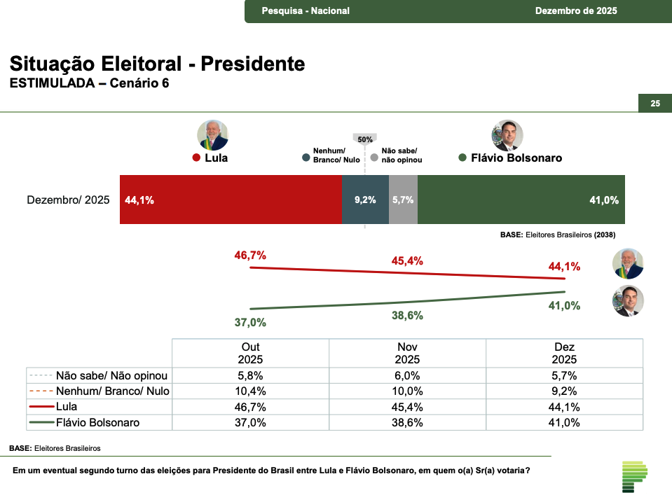 Na simulação de segundo turno, o presidente Luiz Inácio Lula da Silva aparece com 44,1% das intenções de voto, enquanto o senador Flávio Bolsonaro registra 41%, segundo levantamento divulgado pelo Instituto Paraná Pesquisas. A diferença entre os dois é de 3,1 pontos percentuais.