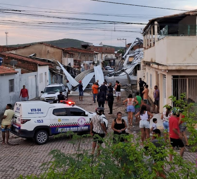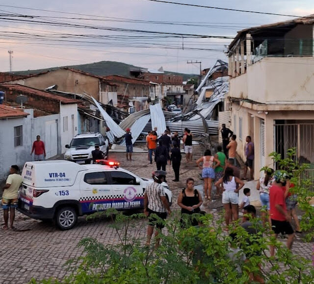 Parte da cobertura de zinco de uma faculdade foi arrancada pela forte ventania e arremessada a cerca de 300 metros de distância, atingindo e danificando os telhados de três residências na Rua Eugênio Lira, no Bairro Nazaré, em Jacobina, na tarde deste sábado, 03 de janeiro de 2026.