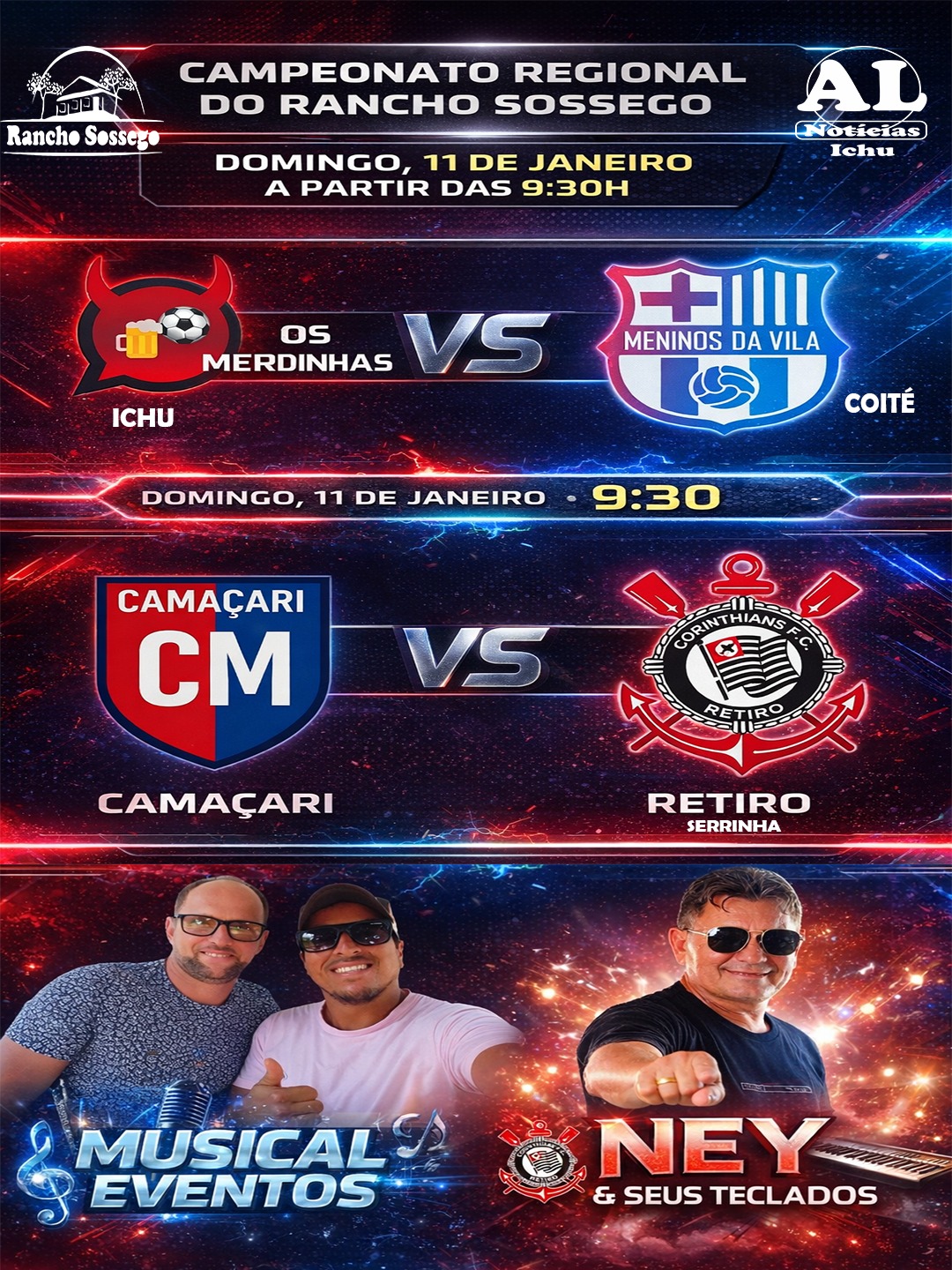 Após uma breve pausa em virtude dos festejos de final de ano, o Campeonato Regional do Rancho Sossego, em Ichu, será retomado neste domingo, 11 de janeiro, a partir das 9h30, com a realização dos jogos válidos pelo Grupo B da competição.