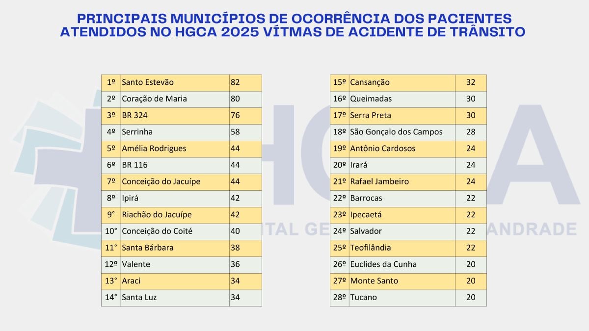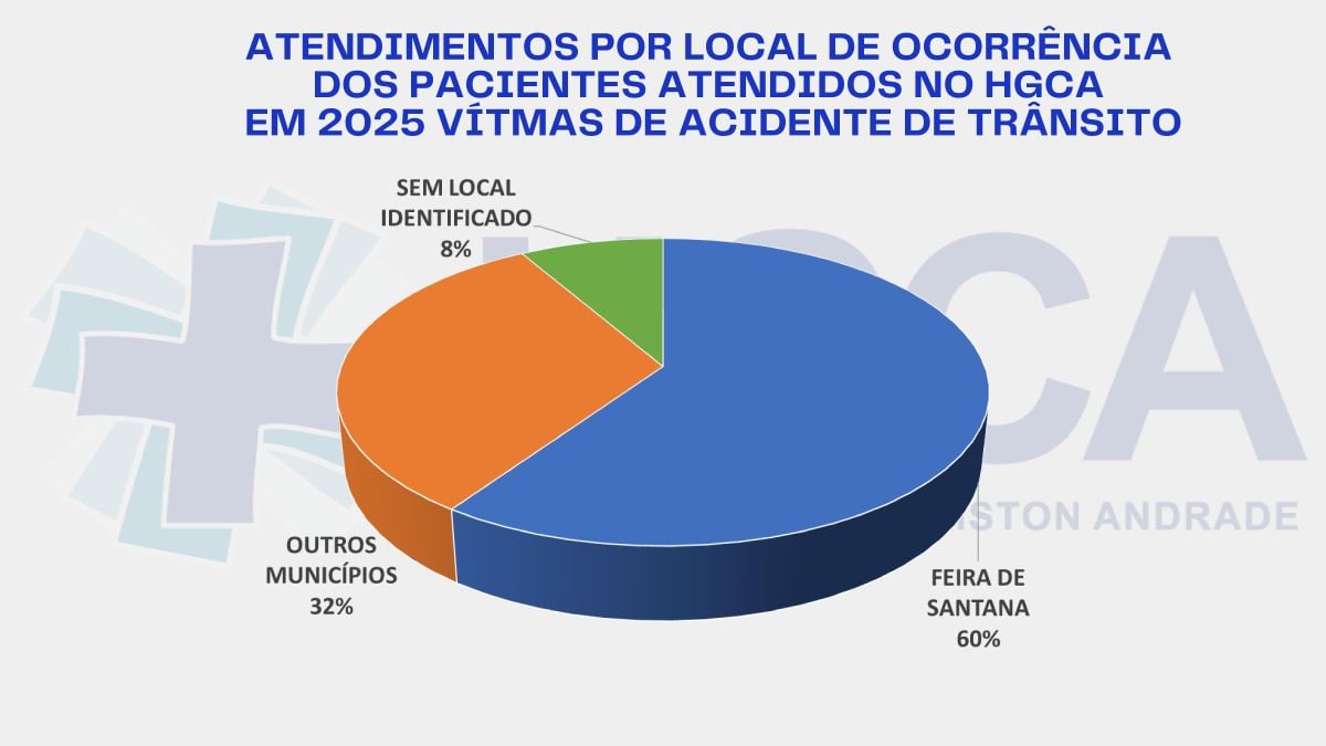 Ao longo de todo o ano de 2025, o Hospital Geral Clériston Andrade (HGCA) realizou o atendimento de 3.773 pessoas vítimas de acidentes de trânsito. O dado revela um crescimento de quase 7% em relação ao ano anterior. Apesar de a unidade receber pacientes de 126 municípios, 60% das vítimas surgiram a partir de acidentes em Feira de Santana.