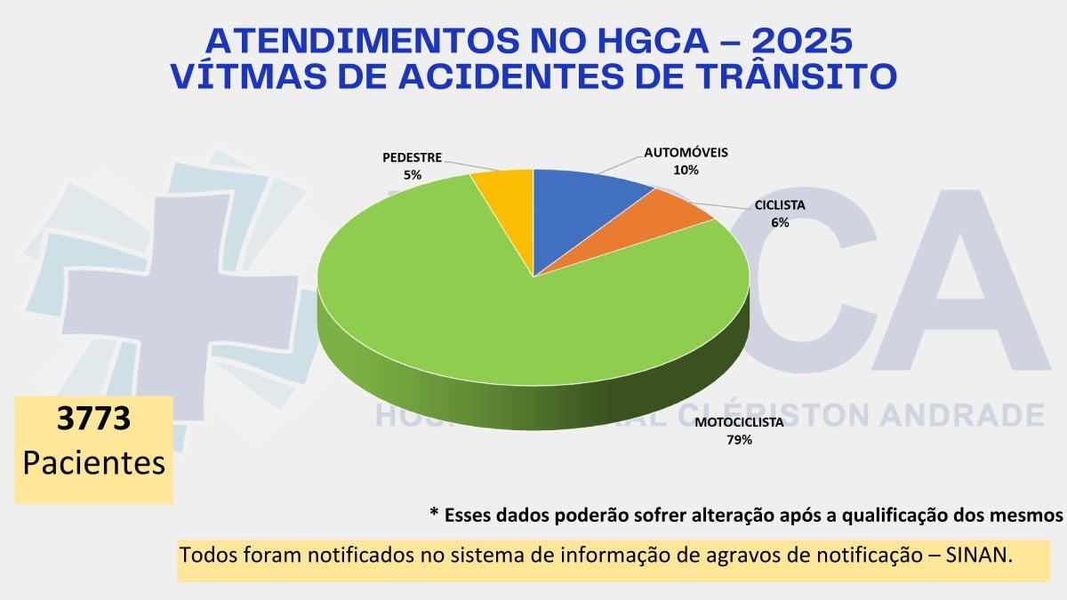 França também lembrou que cerca de 60% dos pacientes vítimas de acidentes de trânsito atendidos no HGCA são do sexo masculino, na faixa etária dos 16 aos 35 anos. O perfil também se repete quando é feito um recorte com foco apenas no número de óbitos de pessoas que foram vítimas do trânsito.