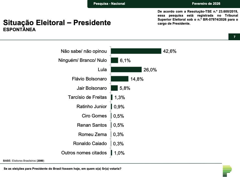 Na pesquisa espontânea, quando não são apresentados nomes aos entrevistados, Lula aparece com 26% das intenções de voto. Em seguida estão Flávio Bolsonaro (PL), com 14,8%, e Jair Bolsonaro (PL), com 5,8%. Outros nomes citados somam percentuais inferiores, enquanto 42,6% dos entrevistados afirmaram não saber ou não opinar.