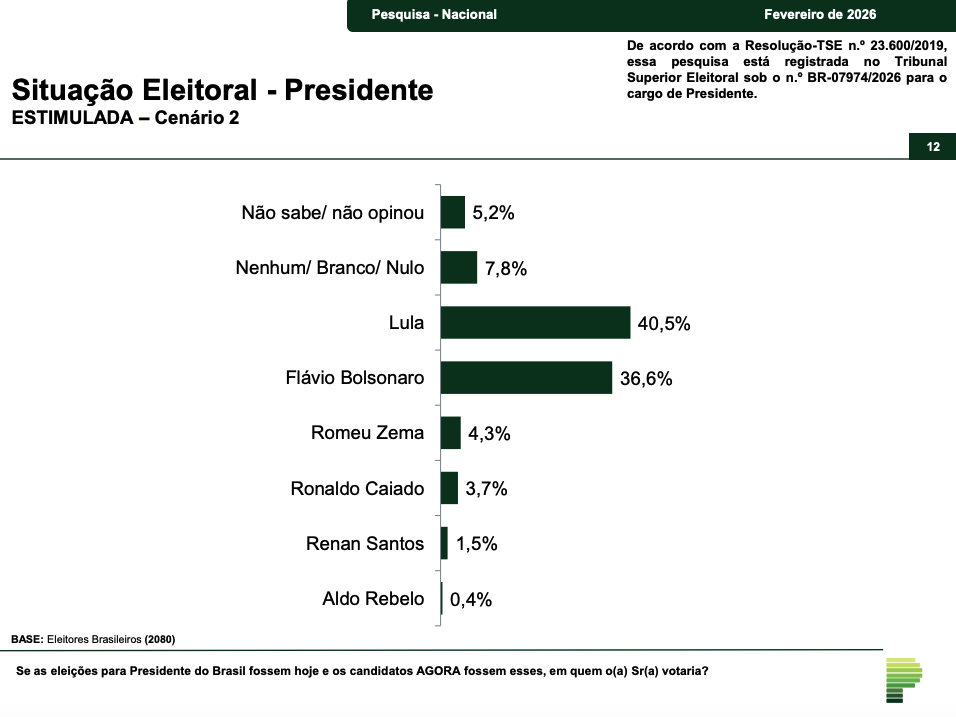 No cenário estimulado principal, em que os candidatos são apresentados aos eleitores, Lula registra 39,6% das intenções de voto, seguido por Flávio Bolsonaro, com 35,3%. Ratinho Junior aparece com 7,6%, Romeu Zema com 3,8%, Renan Santos com 1,5% e Aldo Rebelo com 0,5%. Outros 6,7% declararam voto branco, nulo ou em nenhum candidato, enquanto 5% não souberam responder.